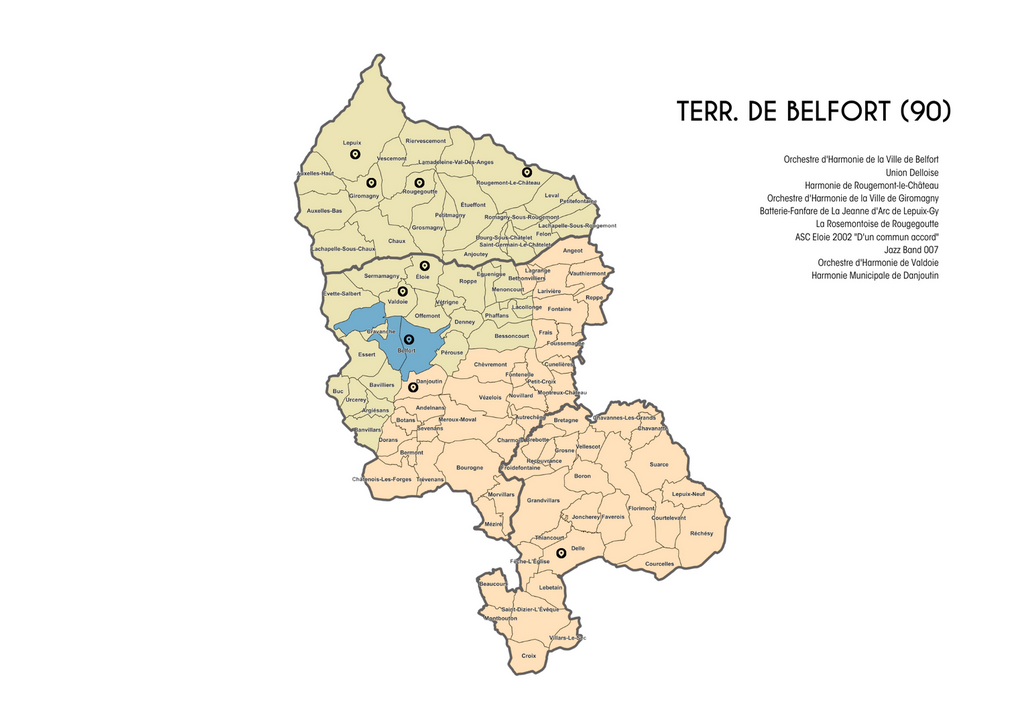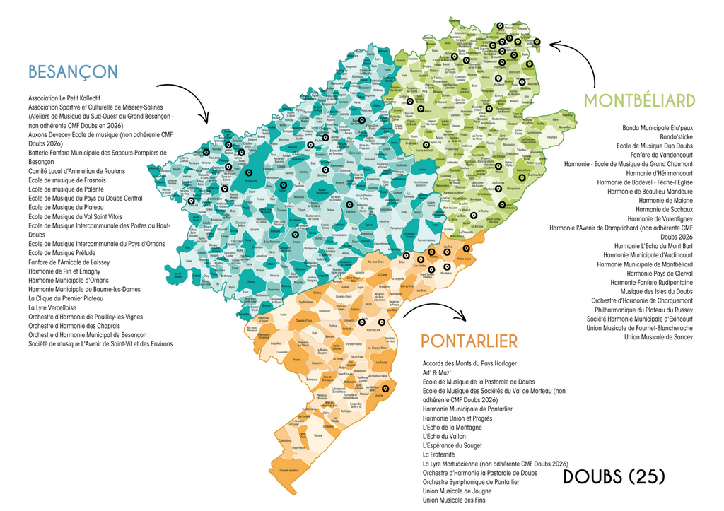 Côté Franche-Comté, la création des fédérations départementales est en cours, il n'y a pour le moment que CMF Doubs. Les sociétés musicales qui apparaissent ci-dessous pour le Jura, la Haute-Saône et le Territoire de Belfort sont les sociétés qui été adhérentes à l'ancienne Fédération musicale de Franche-Comté. Il y a environ 110 sociétés musicales sur la Franche-Comté.